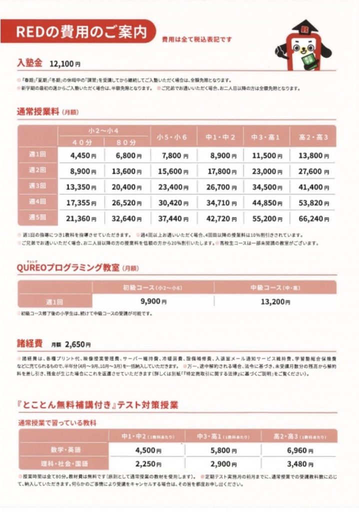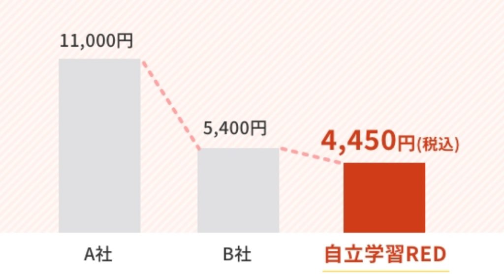 自立学習塾REDは正社員講師が指導する個別指導なのに、他の個別指導塾と比べても安心の低料金。AIタブレットがお子さまの学習効率を向上させ、講師陣の対応時間も適切なものになるからこそ実現できる低価格で、他の学習塾に負けない質の高い学習を提供いたします。